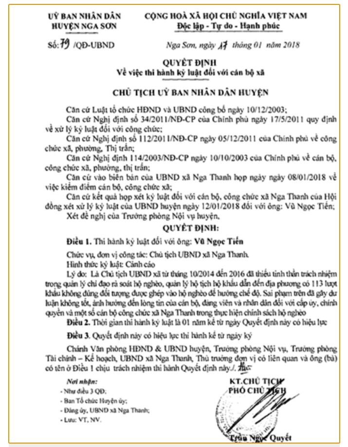 QĐ kỷ luật CT UBND xã Nga Thanh vì sai phạm trong chính sách hộ nghèo