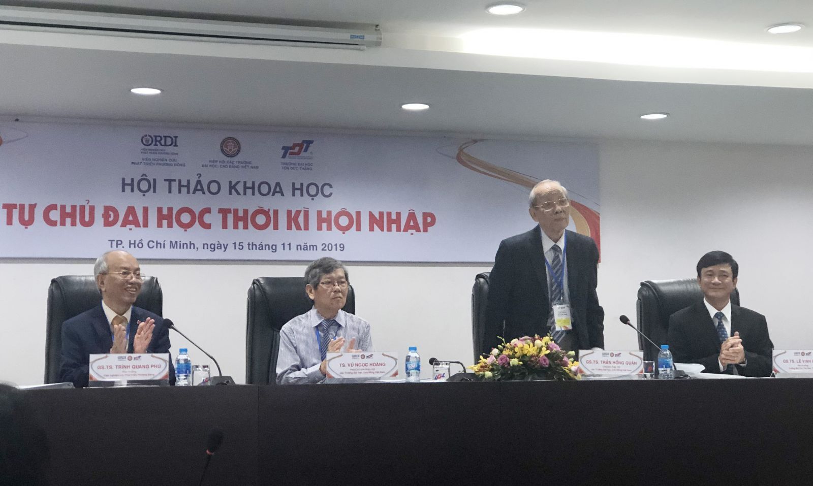 VNHN - Ngày 15/11/2019, tại trường Đại học Tôn Đức Thắng, TP.Hồ Chí Minh, Hiệp hội các Trường Đại học Cao đẳng Việt Nam phối kết hợp với Viện Nghiên cứu Phát triển Phương Đông và trường Đại học Tôn Đức Thắng đã tổ chức Hội thảo khoa hoc: Tự chủ Đại học thời kỳ Hội nhập.