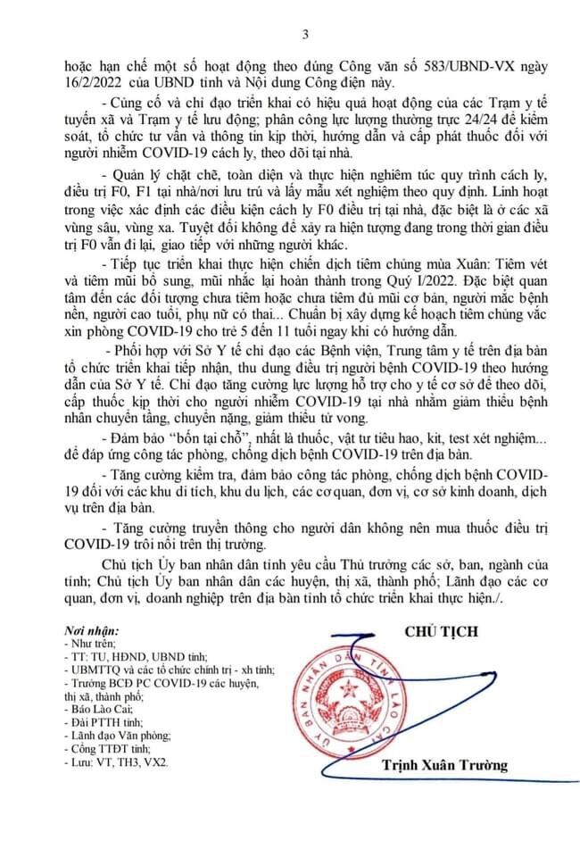 - Tiếp tục thực hiện nghiêm các biện pháp phòng, chống dịch tại Công văn số 583/UBND-VX ngày 17/2/2022 và Kế hoạch số 377/KH-UBND ngày 28/10/2021 của UBND tỉnh về việc “Thích ứng an toàn, linh hoạt, kiểm soát hiệu quả dịch COVID-19 trên địa bàn tỉnh Lào Cai”