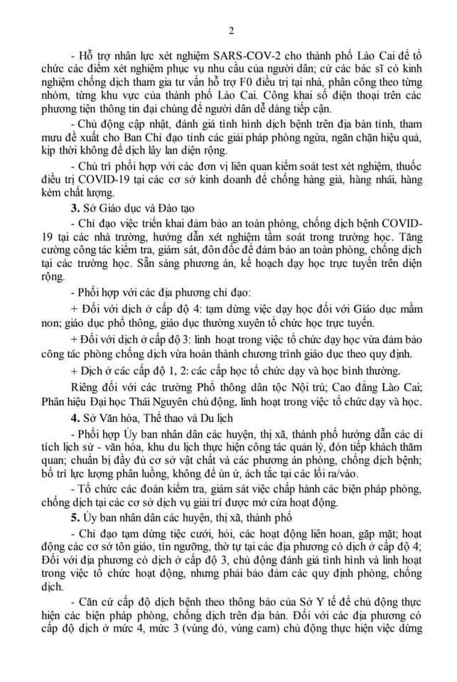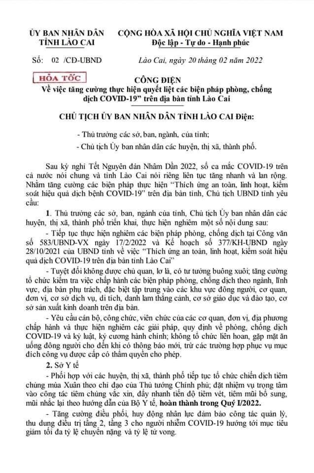 Nhận thấy số ca mắc COVID-19 trên địa bàn cả nước nói chung và tỉnh Lào Cai nói riêng liên tục tăng nhanh và lan rộng sau kỳ nghỉ tết Nguyên Đán 2022. Ngày 20/02/2022, Chủ tịch UBND đã tỉnh ban hành văn bản hỏa tốc số 02 /CĐ-UBND về việc "Tăng cường thực hiện quyết liệt các biện pháp phòng, chống dịch COVID-19" trên địa bàn tỉnh, công điện yêu cầu: