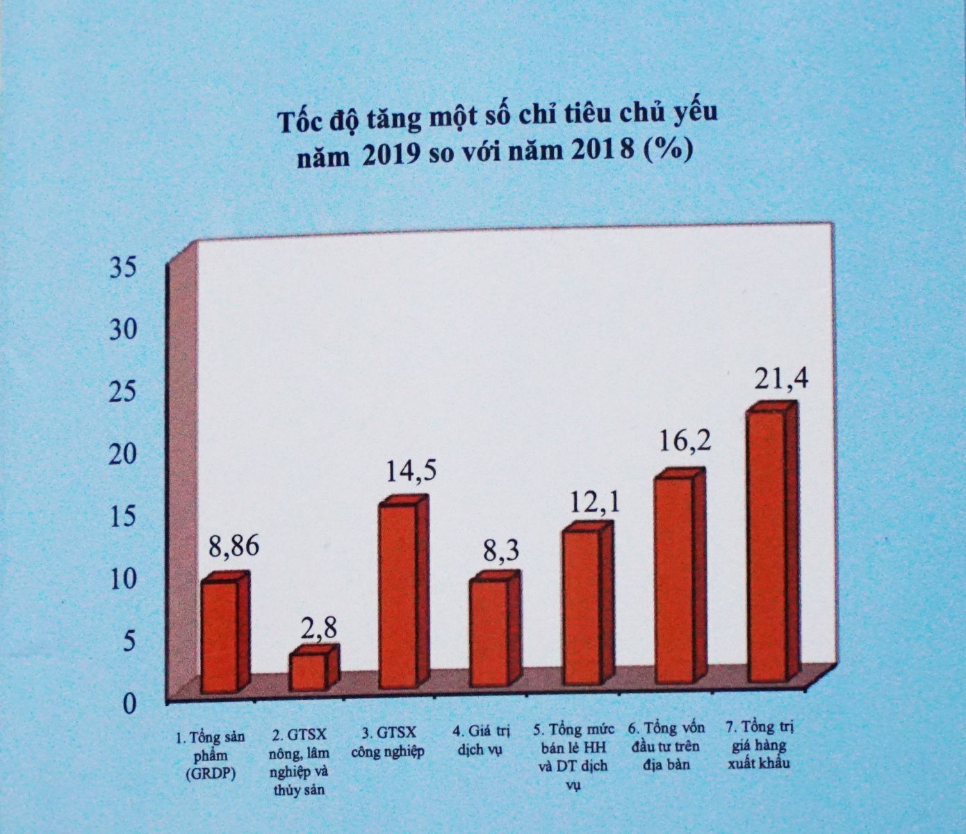 Tổng sản phẩm trên địa bàn tỉnh (GRDP) theo giá hiện hành năm 2019 ước đạt 71.503 tỷ đồng; cơ cấu kinh tế tiếp tục chuyển dịch theo hướng tích cực, tăng tỷ trọng khu vực công nghiệp và xây dựng, giảm tỷ trọng khu vực nông, lâm nghiệp và thủy sản. Tổng sản phẩm theo giá hiện hành bình quân đầu người đạt 40,2 triệu đồng, tăng 14,9% (+5,2 triệu đồng) so với năm 2018.