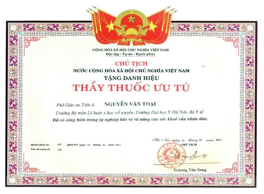 Chúng tôi đã có dịp tiếp xúc với PGS.TS.BS Nguyễn Văn Toại – Chủ phòng khám một người có tâm, có tầm đồng thời cũng là thày thuốc ưu tú, giảng viên cao cấp hiện đang là trưởng môn lý luận YCHT Đại học Y Hà Nội kiêm phó trưởng khoa lão Bệnh viện YHCT Trung Ương. Với bề dày thành tích trong công tác, đặc biệt là những đóng góp đối với lĩnh vực Y học cổ truyền, bác sĩ Nguyễn Văn Toại đã được tặng thưởng nhiều danh hiệu cao quý.