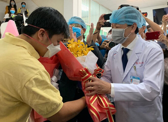 Bệnh nhân nhận hoa chúc mừng khỏi bệnh của bác sĩ Nguyễn Tri Thức (Giám đốc Bệnh viện Chợ Rẫy) và cám ơn các y, bác sĩ.