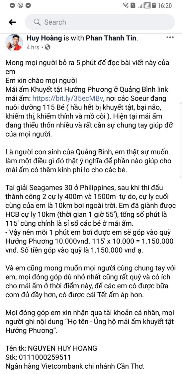 Cụ thể, Huy Hoàng cho biết sẽ trích một phần tiền thưởng ở SEA Games 2019 để làm từ thiện cho mái ấm Hướng Phương ở quê nhà Quảng Bình của anh. Huy Hoàng viết: "Mong mọi người bỏ ra 5 phút để đọc bài viết này của em Mái ấm Khuyết tật Hướng Phương ở Quảng Bình, nơi các soeur đang nuôi dưỡng 115 bé (hầu hết bị khuyết tật, bại não, khiếm thị, khiếm thính và mồ côi). Hiện tại mái ấm đang thiếu thốn nhiều và rất cần sự chung tay giúp đỡ của mọi người. Là người con sinh của Quảng Bình, em thật sự muốn làm một điều gì đó thật ý nghĩa để phần nào giúp cho mái ấm có thêm kinh phí lo cho các bé...".
