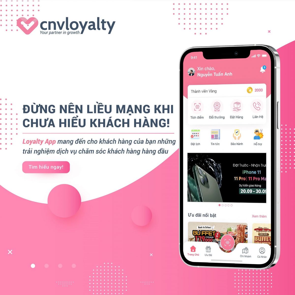 Making a purchase or using a service does not stop as soon as the transaction ends, Loyalty App provides up-to-date features such as Push Notification (notification), Call in App, Loyal program, Birthday gifts, News updates... personalizing and sending to each customer. That will make them feel cared for and respected. According to SmallBiz Genius, more than 56% of customers are loyal only to brands, which respect them.