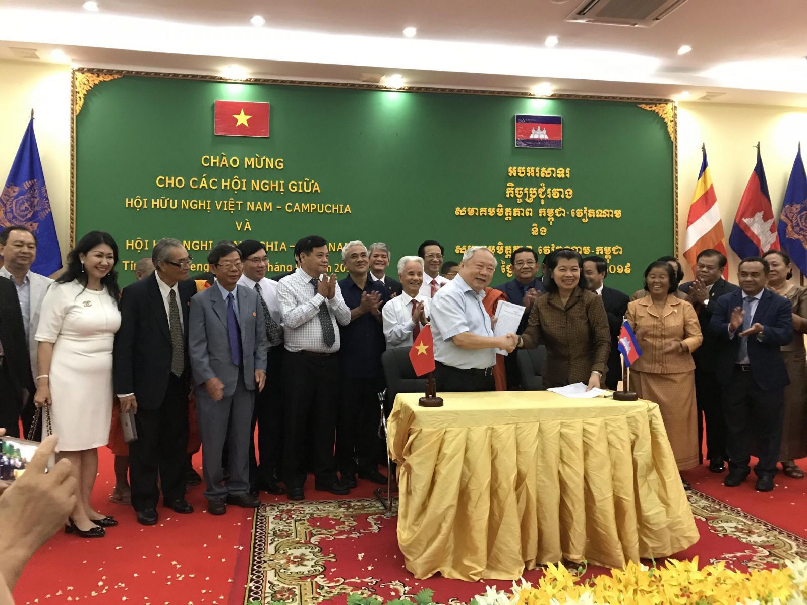 Mr. Vu Mao - Chairman of the Vietnam - Cambodia Friendship Association and Ms. Men Sam An - Deputy Prime Minister of the Royal Cambodian Government, President of the Chairman of the Cambodia -Vietnam Friendship Association : Signing a "joint" between the two associations in 2019 in Cambodia.