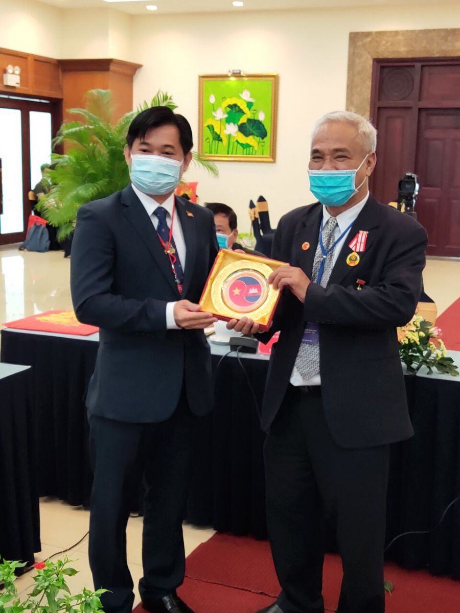 Dr. Le Hong Liem – Vice President of the Southern Center Vietnam – Cambodia Friendship Association (right), presented the association's logo to Dr. Sok Dareth - Consul General of the Kingdom of Cambodia in Ho Chi Minh City at the Congress (November 26, 2021).