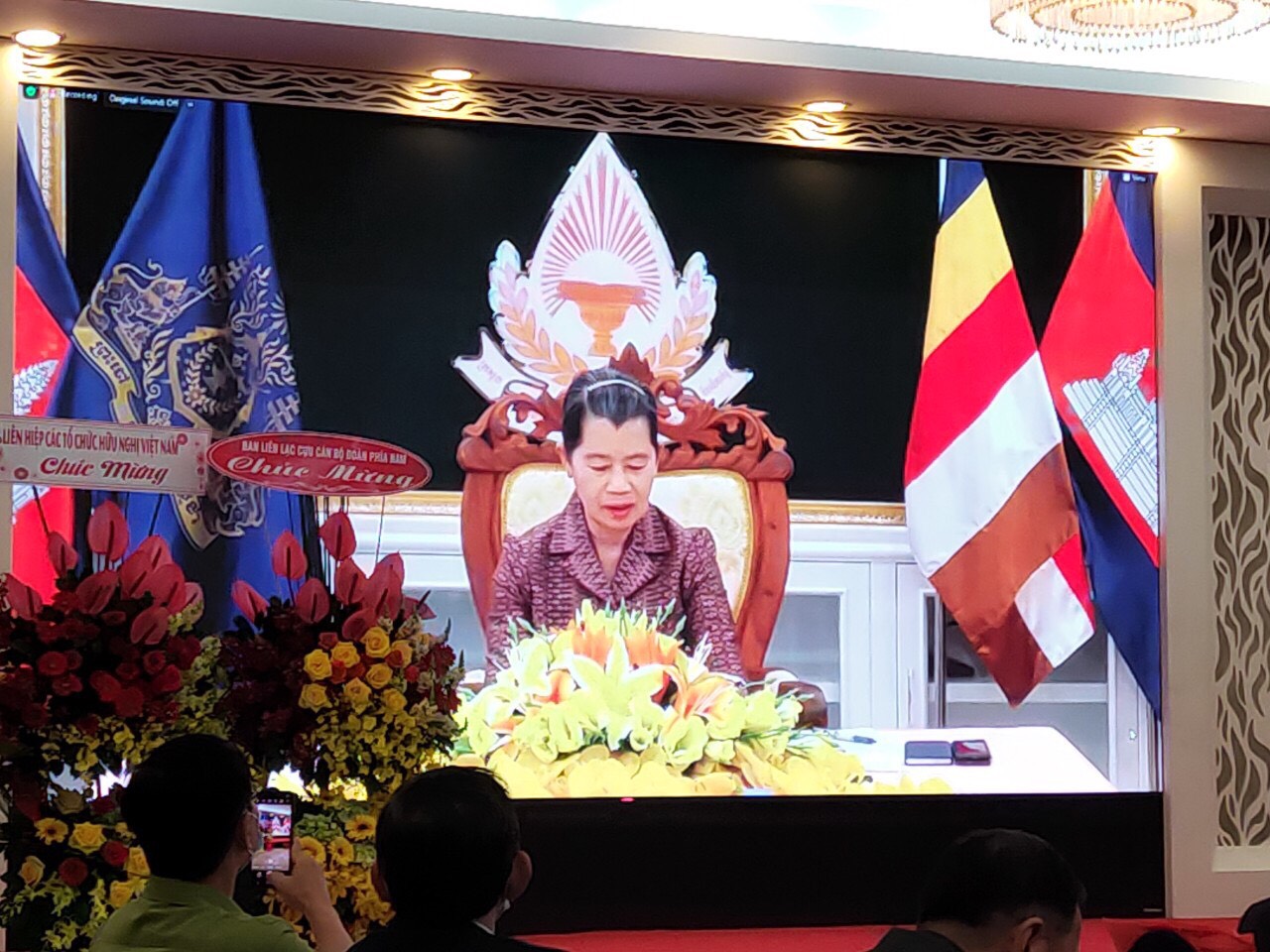 Ms. Kiti Songha Bondith Men Sam An, Deputy Prime Minister of the Royal Cambodian Government and Chairman of the Vietnam - Cambodia Friendship Association, delivered an online congratulatory speech to the congress from Phnom Penh Capital, Cambodia (Photo taken at the City Hall of the City Party Committee Ho Chi Minh City).