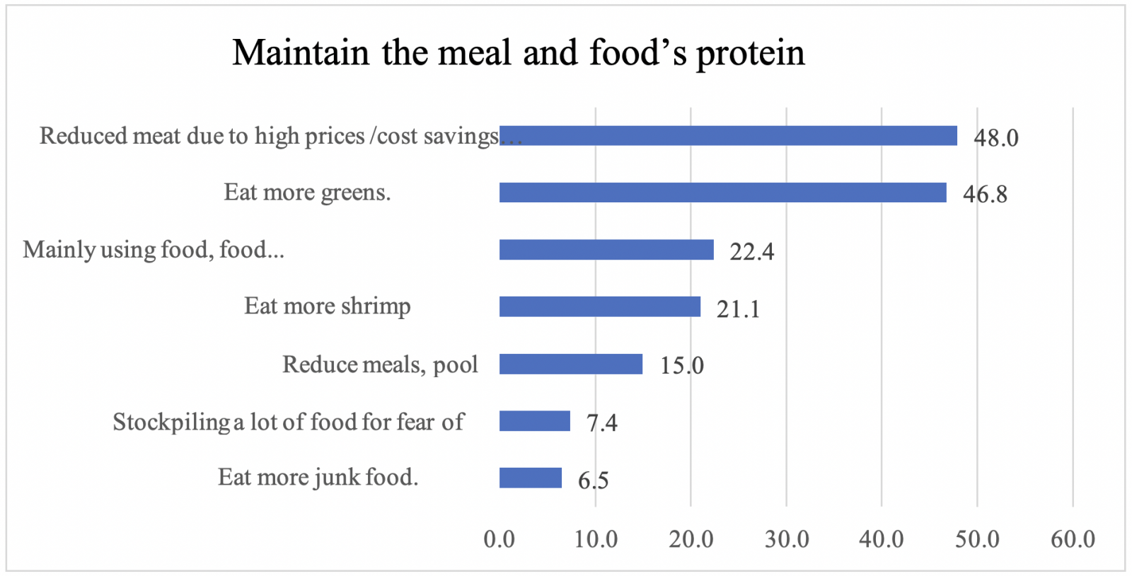Saving money is 48% reduced daily meat intake; 46.8 must eat more greens. 22.4% had to switch from buying daily items at farmers' markets around their residences to using food supported and provided by relatives in the countryside.