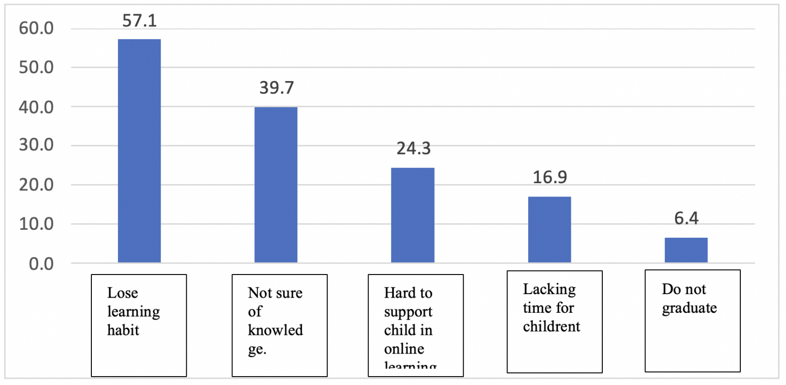 - 57.1% of employees are worried about playing and losing their learning habits; 39.7% are afraid that they will not know the knowledge when studying at home; 6.4% are concerned that their children will not be able to attend classes/ do not graduate. Many parents are forced to lower the standard of their children's learning, accept the declining academic results, only set a target for their children to go to class after the epidemic returns, accompany their children, let their children learn more to supplement the knowledge that is lacking during the epidemic.