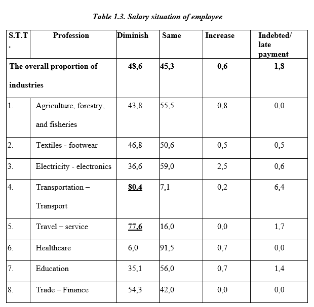 In terms of quantity, nearly 50% of employees suffered a reduction in basic salaries, concentrated in non-state enterprises. Specifically, 80.4% of employees in the transport industry suffered a salary reduction. The second-largest decline was the Tourism-Services sector, with 77.6% of the workforce. Trade - finance, agriculture - forestry - fisheries and textiles - footwear sectors have a rate of salary reduction of less than 50%. One sector with a significant, labor-intensive rate is Electricity and Electronics, with only 36.6% of employees suffering from a pay cut. This is the same as education.