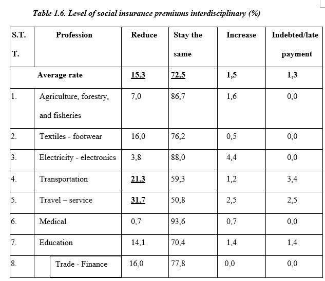 Due to the need to retain employees to recover from the epidemic, the problem of paying social Insurance and other remuneration regimes such as lunch/mid-shift time, meal quality for essential employees is still maintained by the units. The rate of 72.5% of employees is held in these regimes. Only 15.3 were reduced in social insurance premiums.