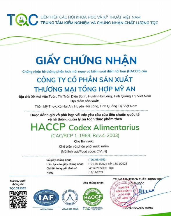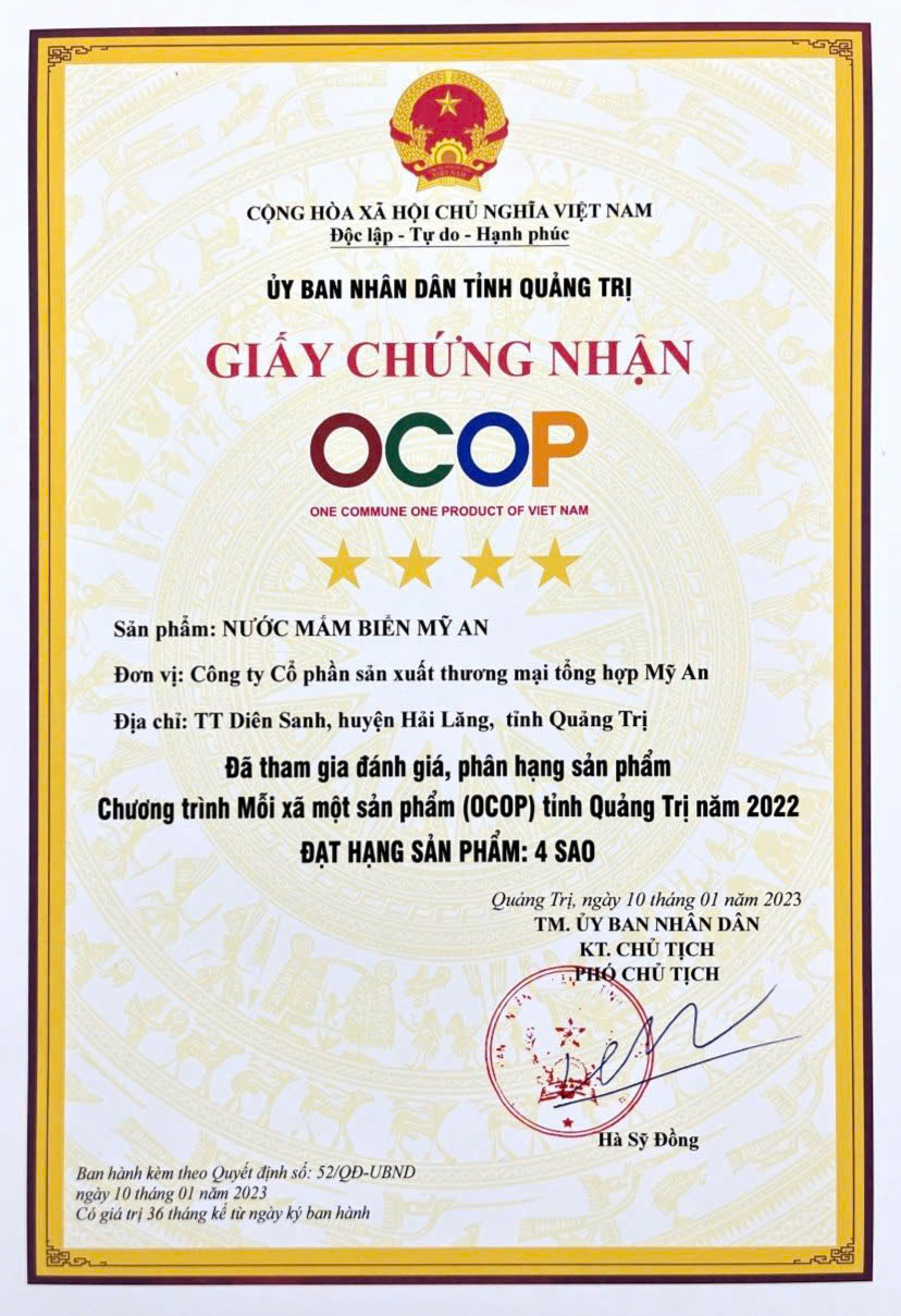 The quality of the product has built the reputation of My An Sea Fish Sauce by My An General Production and Trading Joint Stock Company. Thanks to this, My An Sea Fish Sauce has been officially recognized with a 4-star OCOP certification.
