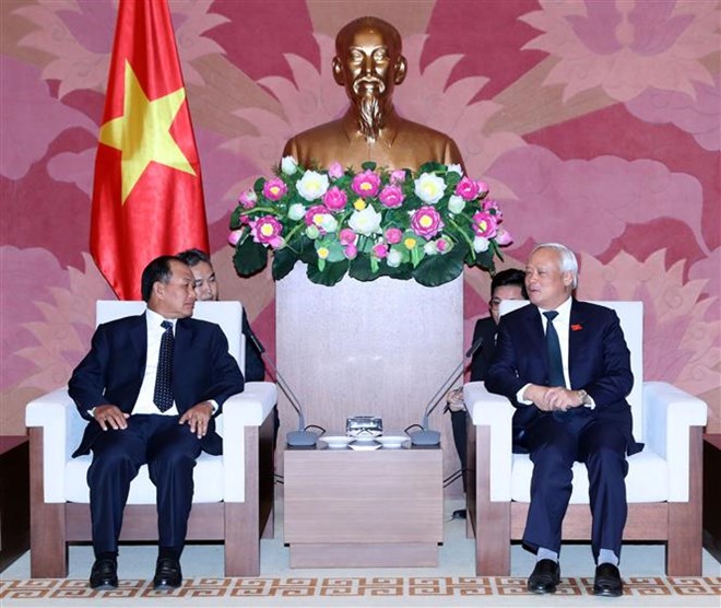 Vice Chairman of the National Assembly Uong Chu Luu (R) receives Lao Justice Minister Xaysi Santivong
