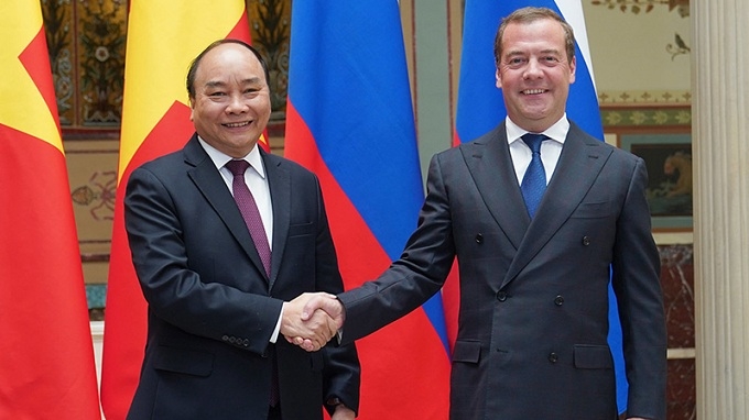 PM Nguyen Xuan Phuc (L) and his Russian counterpart Dmitry Medvedev.