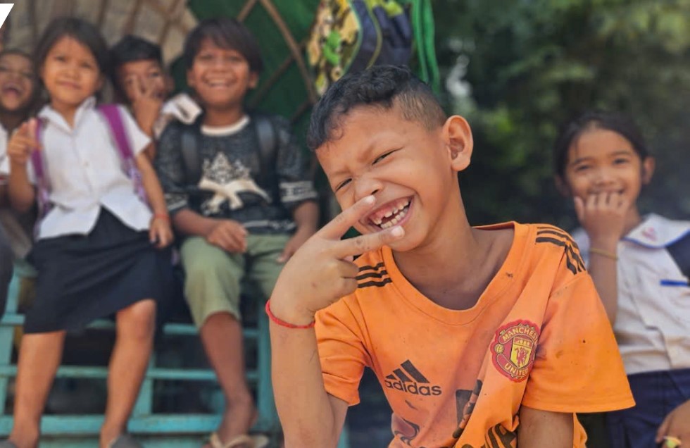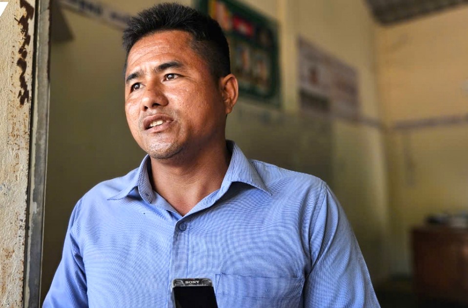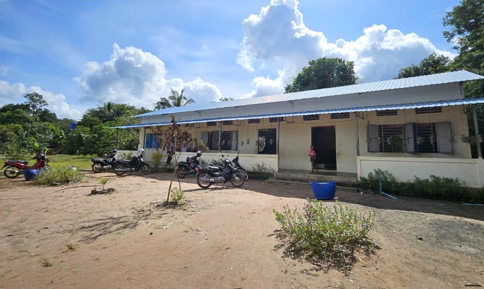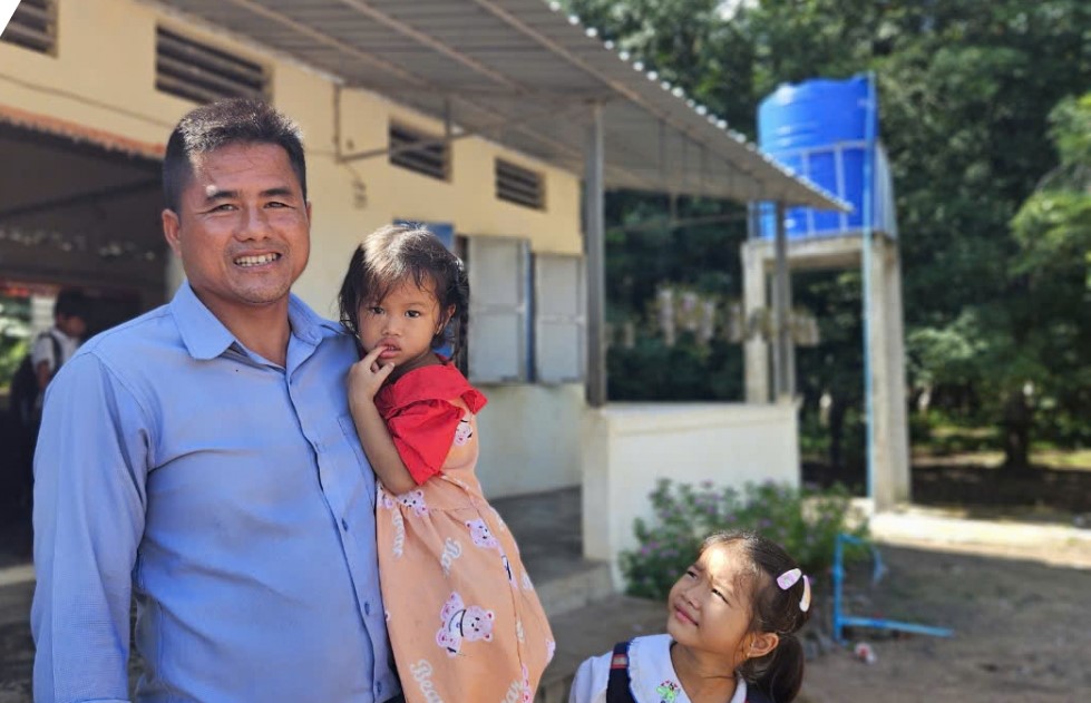 Dim Sok Cheat, a 41-year-old teacher, has been attached to this school for over nine years. He began teaching here after meeting his wife, Ret Sok Han, who is 36 years old. The couple has been dedicated to the school since before they were married, and now they have three children. In the photo, teacher Dim Sok Cheat is with his youngest daughter, aged four, while their two older children, aged seven and six, are both studying at the school.