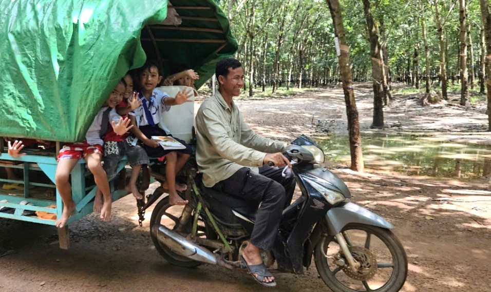 In addition to supporting teachers’ salaries, Phuoc Hoa-Kampong Thom Rubber Company also provides teaching equipment, books, and transportation for the students. The company hires tractors to transport students daily, saving them time and allowing their parents to work with peace of mind.