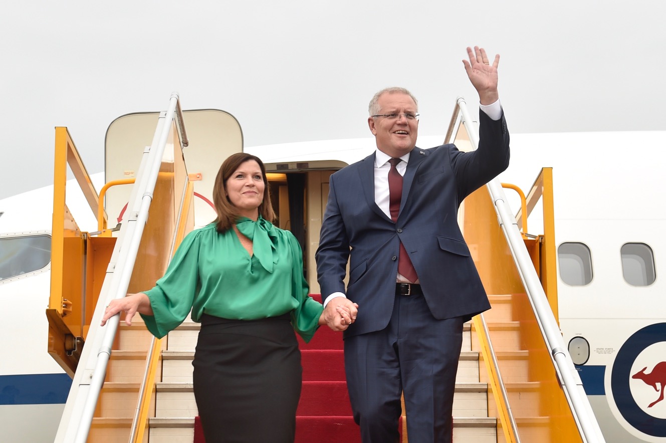 Australian Prime Minister Scott Morrison and his Spouse Jenny Morrison arrive at Noi Bai International Airport on Thursday afternoon. Photo: VGP