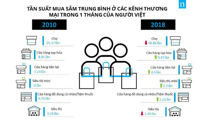 Cùng với đó, báo cáo mới nhất của Nielsen về Xu hướng mua hàng toàn cầu cho thấy, người mua hàng Việt Nam ngày nay đã dần ít đi vào chợ truyền thống, thay vào đó họ đến các cửa hàng tiện lợi, siêu thị mini, cửa hàng bán các sản phẩm chăm sóc cá nhân, cửa hàng thuốc tây hiện đại và cửa hàng tạp hóa thường xuyên hơn.