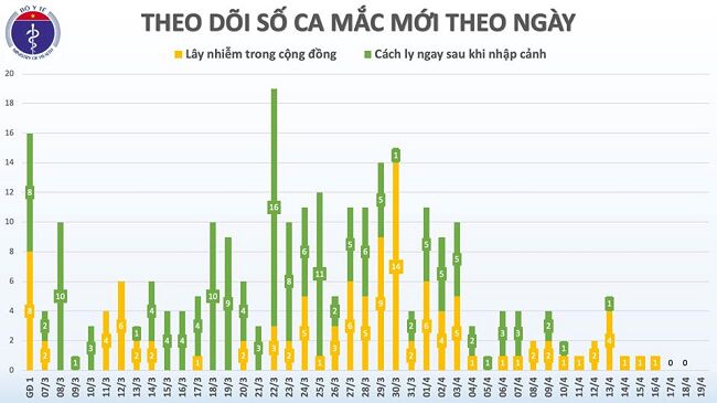 Số ca mắc mới tính từ 18h ngày 17/4 đến 6h00 ngày 19/4: 0 ca. Như vậy kể từ ngày 7/3 khi có ca bệnh số 17 xuất hiện, đến hôm nay là lần đầu tiên đã tròn 3 ngày, Việt Nam không có ca mắc mới COVID-19.
