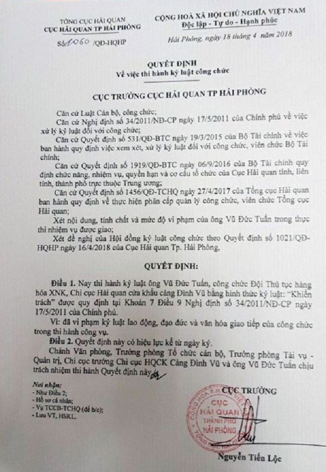 Quyết định kỷ luật đối với ông Vũ Đức Tuấn, công chức thuộc Đội thủ tục hàng hóa xuất nhập khẩu, Chi cục Hải quan cửa khẩu cảng Đình Vũ