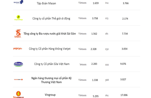 1- Tập đoàn Masan có doanh thu 1,659 tỷ USD, lợi nhuận ròng 214 triệu USD. Giá trị thị trường vốn hoá của Masan đạt 3,766 tỷ USD.