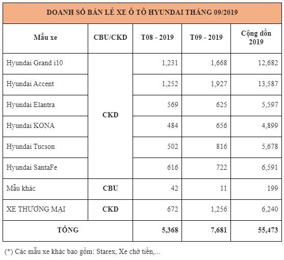 Doanh số bán hàng các mẫu xe Hyundai trong tháng 09/2019 cụ thể như sau: (Đơn vị: Xe)