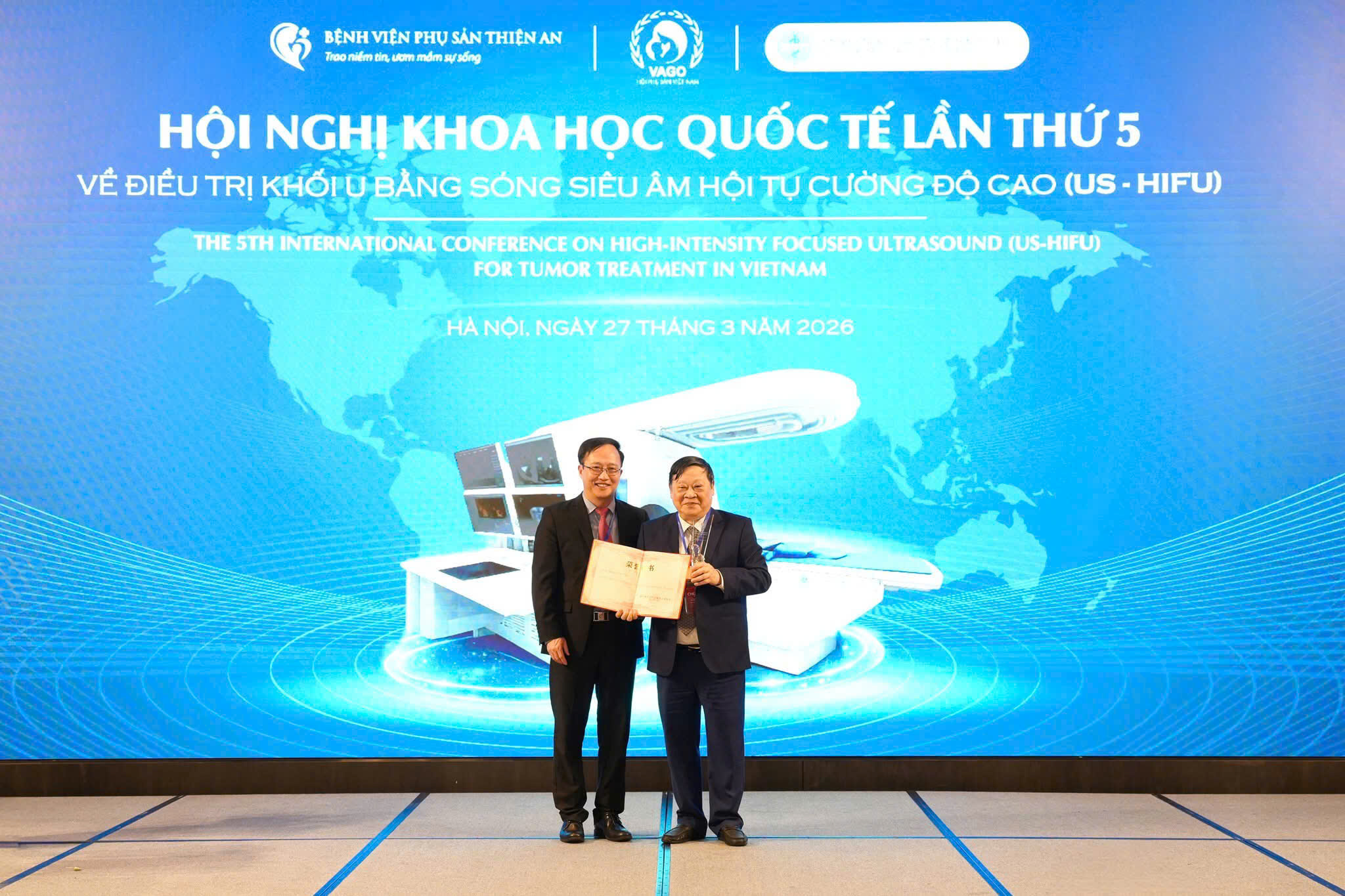 Đặc biệt, tại Hội nghị Khoa học Quốc tế lần thứ 5 về điều trị khối u bằng sóng siêu âm hội tụ cường độ cao (US-HIFU), đội ngũ chuyên gia Bệnh viện Phụ sản Thiện An do GS.TS.BS Nguyễn Viết Tiến - Giám đốc Bệnh viện - dẫn dắt đã được GS. Zhang Lian - Giám đốc Bệnh viện HAIFU Trùng Khánh, Trung Quốc - trực tiếp trao cúp vinh danh với giải thưởng “Chuyên gia HIFU có tầm ảnh hưởng lớn nhất năm 2025”. Có thể nói, Giải thưởng là sự ghi nhận cho hành trình bền bỉ của đội ngũ Thiện An trong việc đưa công nghệ US-HIFU đến gần hơn với người bệnh tại Việt Nam. Không chỉ dừng lại ở việc tiếp cận một kỹ thuật tiên tiến hoàn toàn mới, đội ngũ chuyên gia Thiện An đã từng bước làm chủ công nghệ, chuẩn hóa quy trình và triển khai hiệu quả trong thực tiễn, mang lại thêm lựa chọn điều trị không xâm lấn cho các bệnh lý như u xơ tử cung và lạc nội mạc tử cung, giúp hạn chế can thiệp phẫu thuật và bảo tồn tử cung cho người phụ nữ.