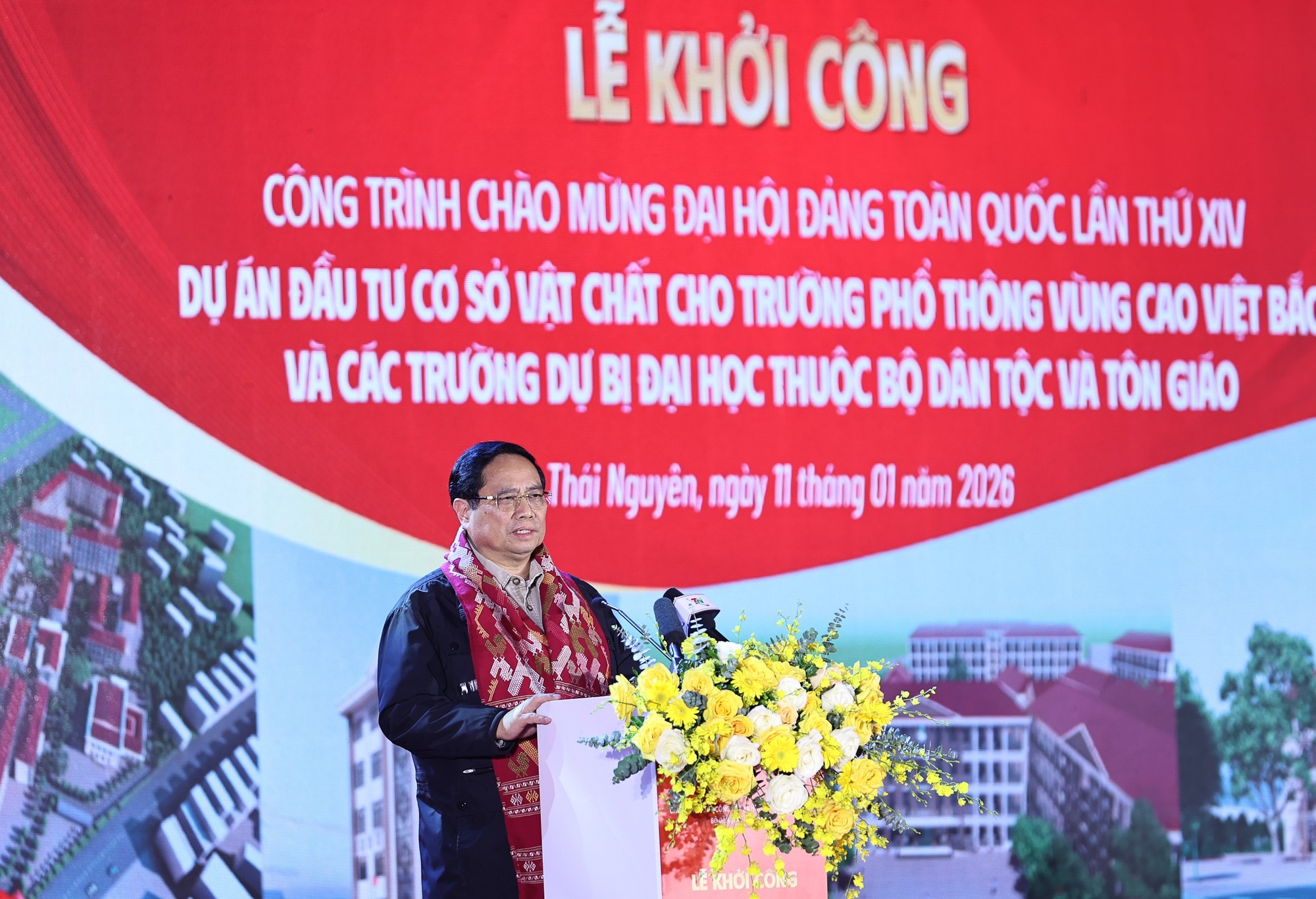 Chiều 11/1, tại tỉnh Thái Nguyên, Thủ tướng Phạm Minh Chính dự lễ khởi công 3 dự án đầu tư cơ sở vật chất cho các trường chuyên biệt - Trường Phổ thông Vùng cao Việt Bắc, Trường Dự bị đại học TPHCM và Trường Dự bị đại học dân tộc Sầm Sơn – công trình chào mừng Đại hội Đảng toàn quốc lần thứ XIV.