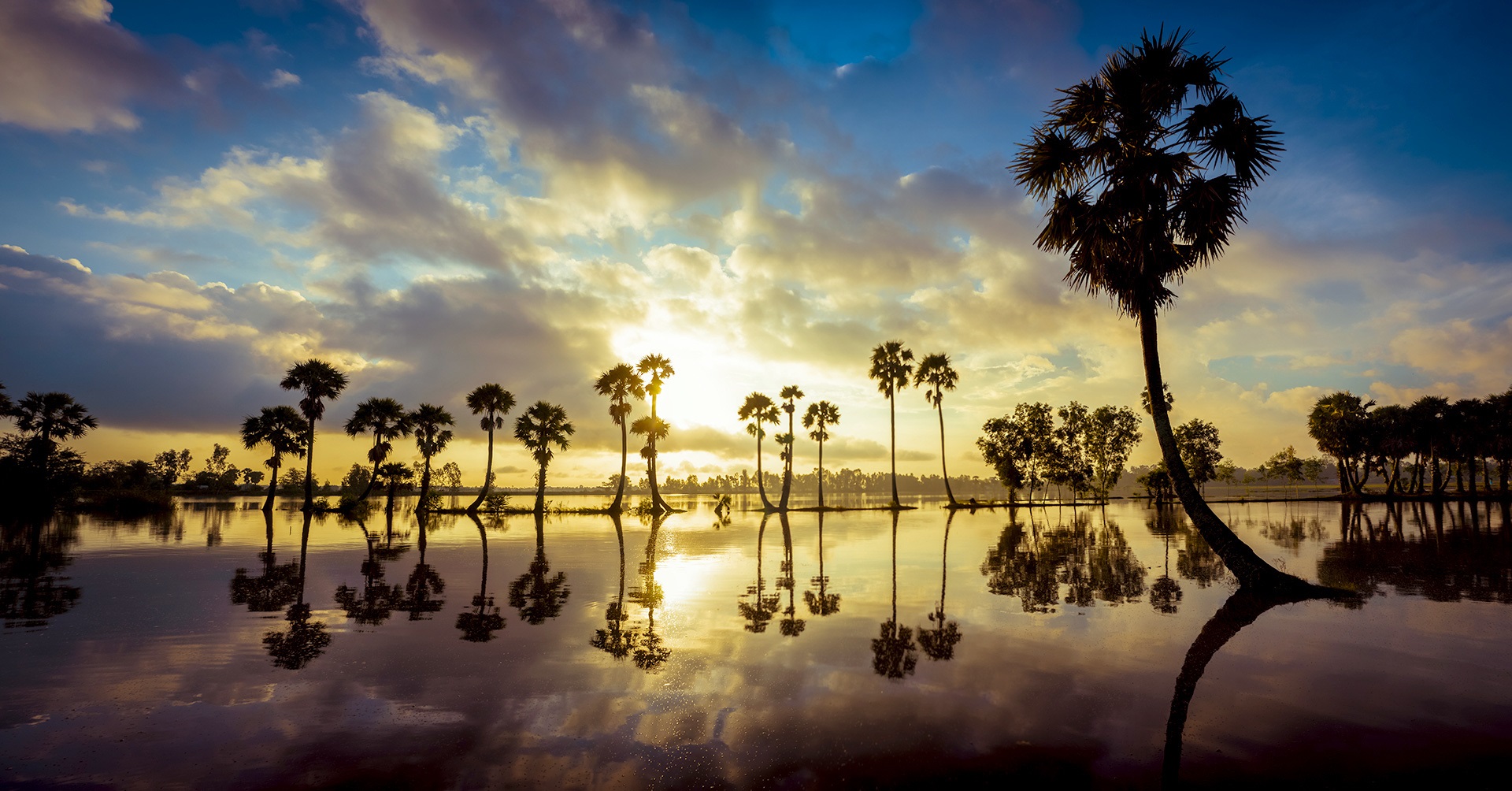 Cánh đồng thốt nốt mùa nước nổi đẹp ngẩn ngơ dưới hoàng hôn - Ảnh: TL