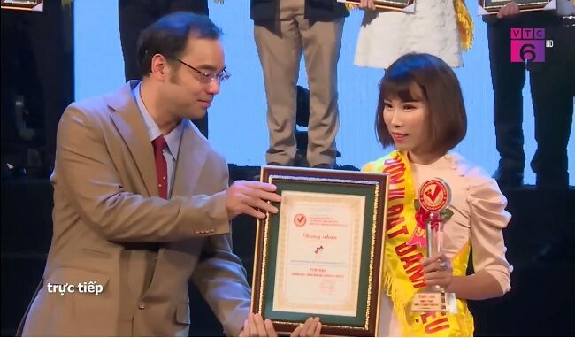 Bà Trần Thu Phương - Giám đốc truyền thông Công ty TNHH ANNATP GROUP TOÀN CẦU nhận cúp và chứng nhận Top 100 “Thương hiệu, nhãn hiệu độc quyền, uy tín” năm 2019