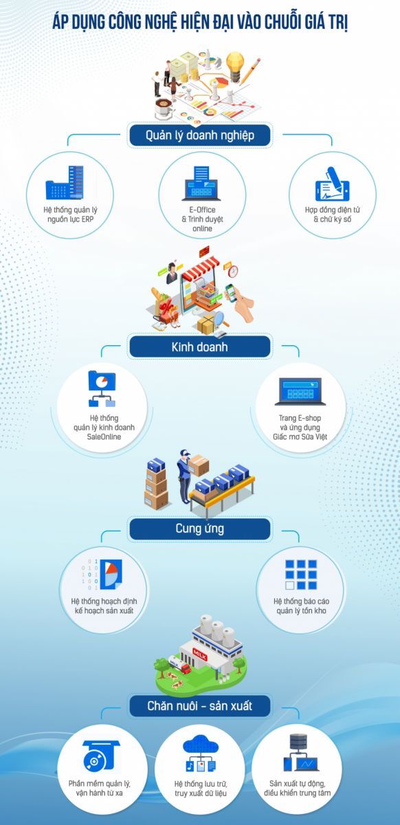 Các nhà máy và trang trại Vinamilk áp dụng triệt để tự động hóa và công nghệ 4.0, đảm bảo quản lý từ xa và có tính hệ thống. "Chuỗi cung ứng của Vinamilk hoạt động hoàn toàn dựa vào hệ thống công nghệ thông tin, kết nối từ đầu vào - việc thu mua nguyên vật liệu, cho đến đầu ra cuối cùng - sản phẩm đến tay người tiêu dùng", đại diện Vinamilk cho biết.