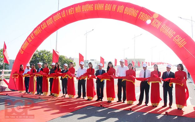 Lãnh đạo tỉnh Bắc Giang dự Lễ thông xe kỹ thuật cầu vượt QL1 kết nối đường vành đai IV với đường trong KCN Quang Châu, huyện Việt Yên vào ngày 14/11/2020. Ảnh: CTTĐT Bắc Giang