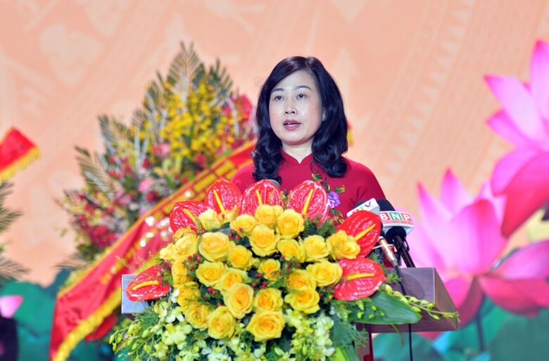Bí thư Tỉnh ủy Băc Ninh Đào Hồng Lan phát biểu tại lễ kỹ niệm 190 năm thành lập, 25 năm tái lập tỉnh Bắc Ninh. Ảnh: BBN