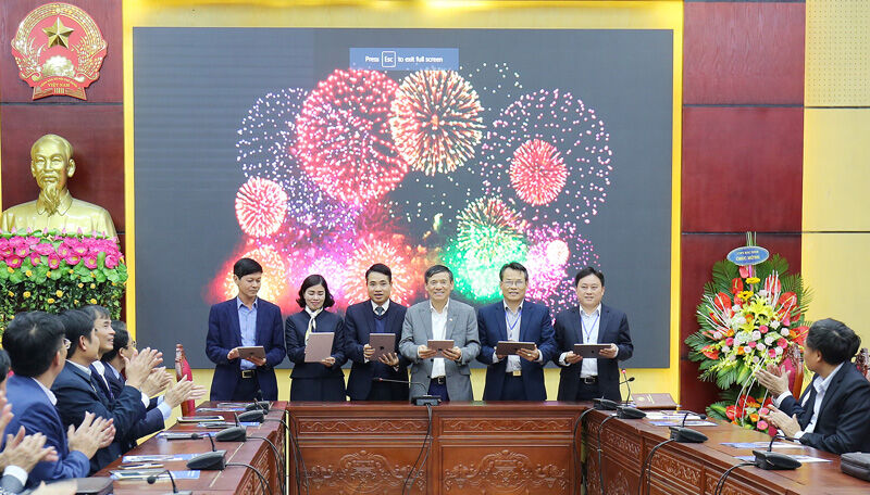 Đồng chí Nguyễn Tiến Nhường, Phó Chủ tịch Thường trực UBND tỉnh và lãnh đạo một số sở, ngành tỉnh nhấn nút khai trương Dịch vụ công trực tuyến mức độ 4 các ngành Kế hoạch - Đầu tư, Tư pháp, Công Thương kết nối hệ thống thông tin của Trung ương và Cổng DVCQG.
