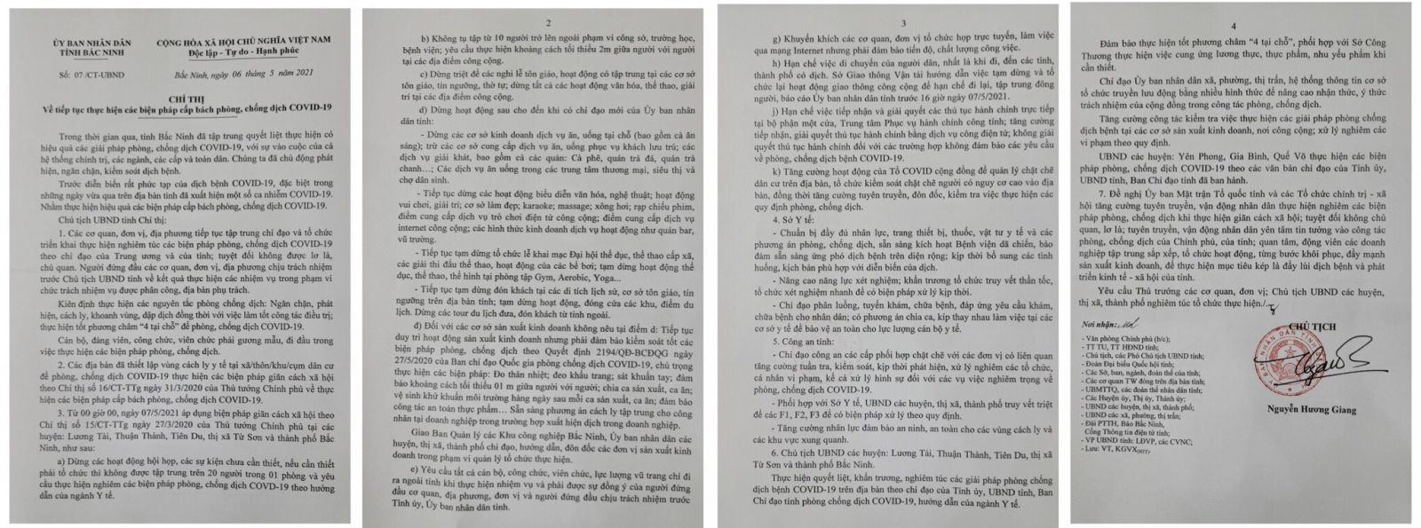 Trước diễn biến rất phức tạp của dịch bệnh COVID-19, đặc biệt trong những ngày vừa qua trên địa bàn tỉnh Bắc Ninh đã xuất hiện một số ca nhiễm. Nhằm thực hiện hiệu quả các biện pháp cấp bách phòng, chống dịch, đồng chí Nguyễn Hương Giang - Phó Bí thư Tỉnh ủy, Chủ tịch UBND tỉnh, Trưởng Ban Chỉ đạo phòng, chống dịch COVID-19 tỉnh Bắc Ninh có chỉ thị số 07/CT-UBND ngày 06/5/2021.