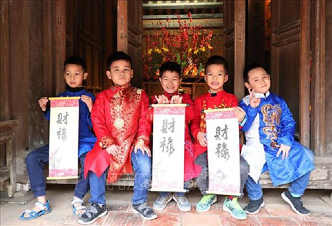 Các em nhỏ có cơ hội tìm hiểu ý nghĩa ngày Tết qua trải nghiệm xin chữ ông Đồ đầu năm (Ảnh: TTXVN)