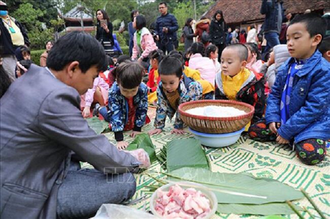 Các em nhỏ hứng thú trải nghiệm "Gói bánh chưng ngày Tết" (Ảnh: TTXVN)