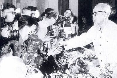 Bác Hồ với các phóng viên báo đài. Ảnh tư liệu