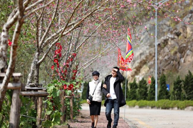 Giữa bảng lảng sương giăng, dạo bước trong không gian ngợp ngời hoa mùa xuân bên triền Hoàng Liên Sơn để cảm nhận sự sống đang tràn vào huyết quản. Những ngày nay, hàng trăm gốc đào dọc đường lên ga đi cáp treo Fansipan đã bắt đầu hé nụ, đồi cải trắng, cải vàng và những vạt tulip đủ sắc màu đã bung nở. Dọc khu vực ga đi cáp treo đến sân mây, hơn 2000 cây sen đá và gần 5000 bông cải tím như dẫn lối du khách vào miền cổ tích.