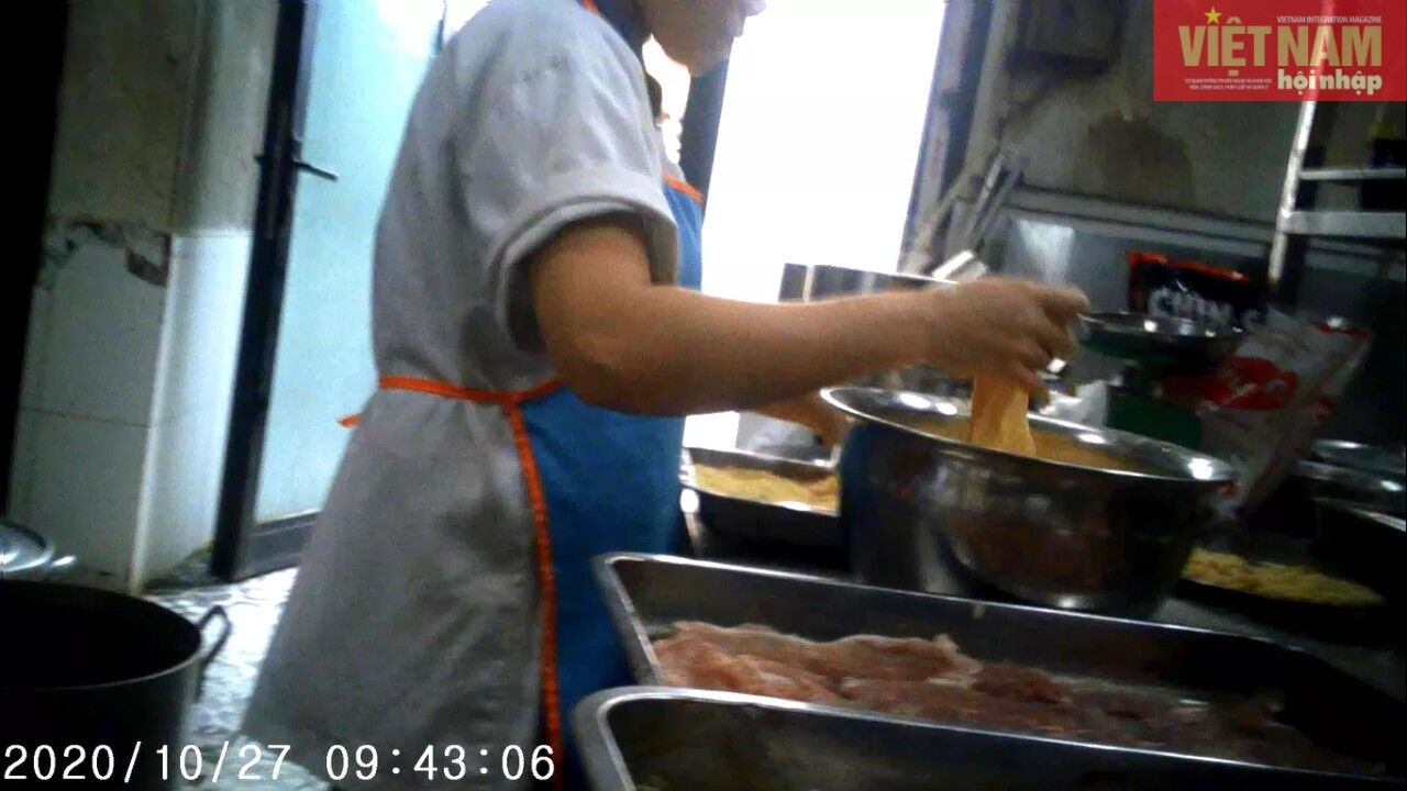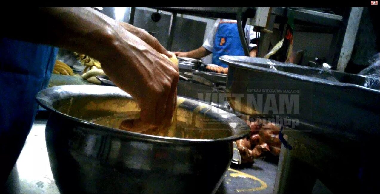 Nhân viên nhà bếp không đeo bao tay khi nhào, nặn thịt lợn chiên.