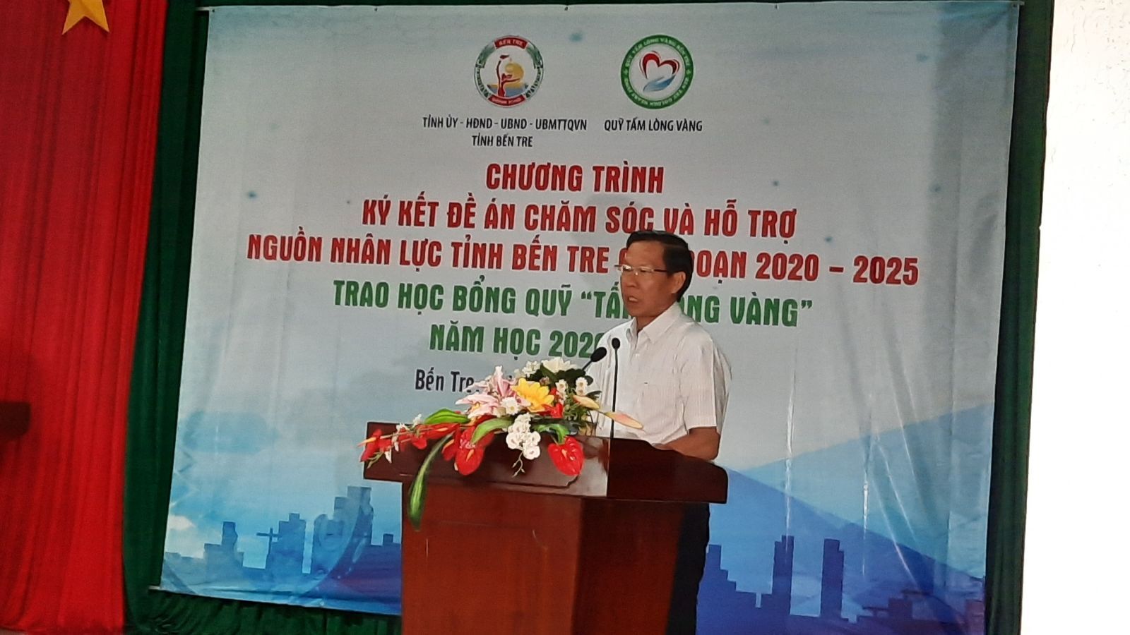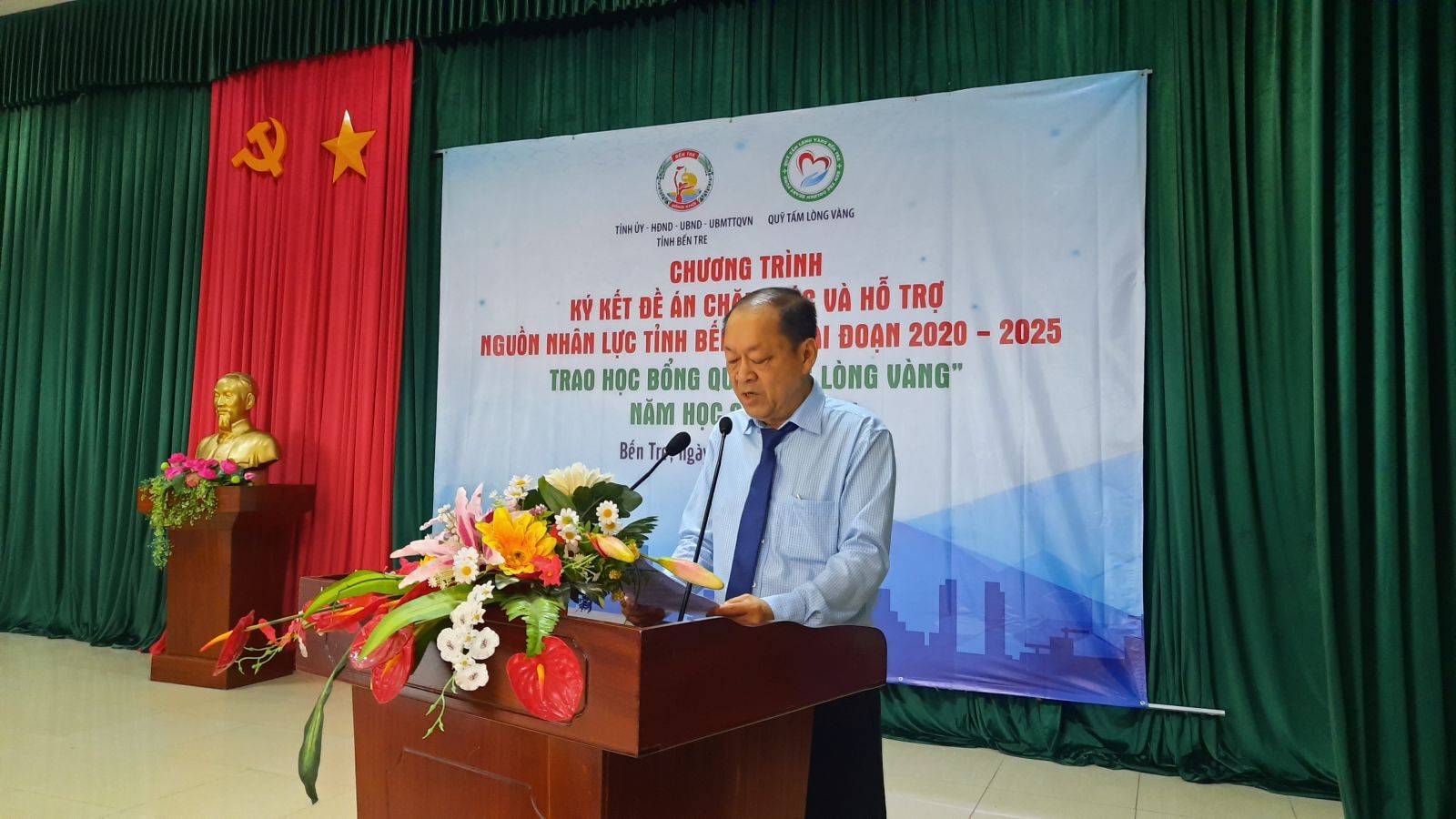 Phát biểu tại buổi lễ, ông Đặng Đức Thành - Chủ tịch Hội đồng quản lý "Quỹ Tấm Lòng Vàng", cho biết: Thông qua kết nối với Ủy ban MTTQ Việt Nam tỉnh và Sở Giáo dục và Đào tạo Bến Tre, Quỹ Tấm lòng vàng đã xây dựng và triển khai Đề án “Chăm sóc và hỗ trợ nguồn nhân lực tỉnh Bến Tre” nhằm trao học bổng cho học sinh nghèo học giỏi các cấp, sinh viên cao đẳng, đại học trên toàn tỉnh Bến Tre.