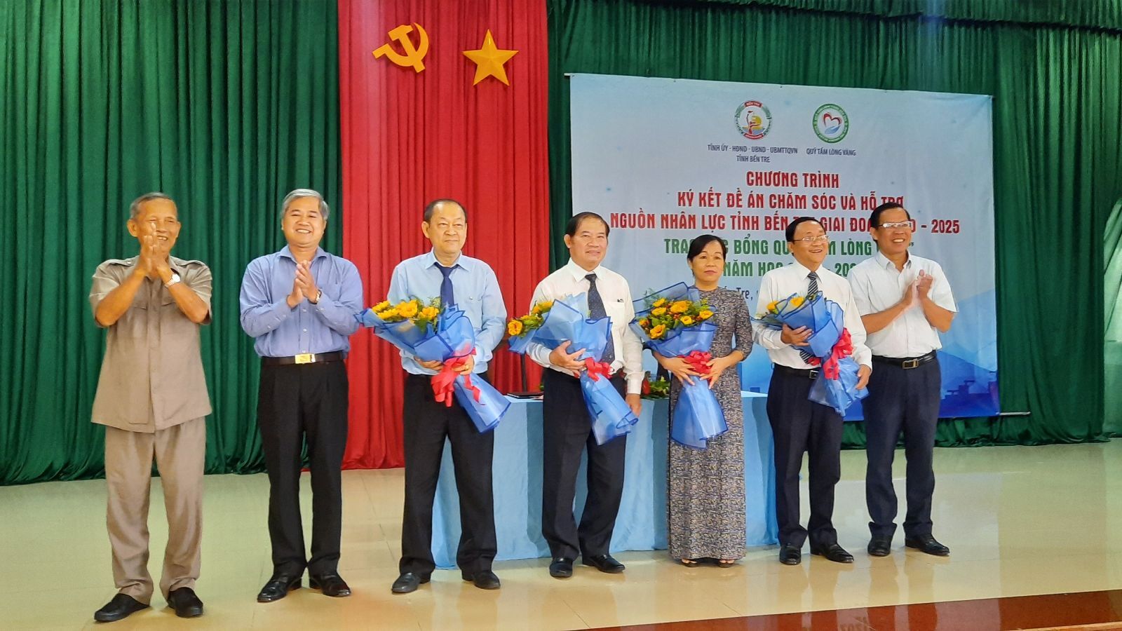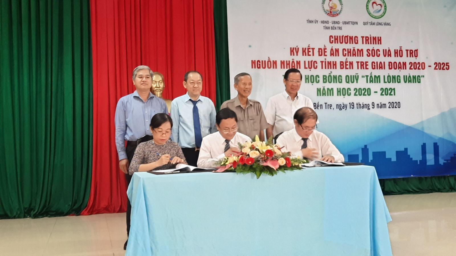 Tại buổi lễ, đại diện lãnh đạo Ủy ban MTTQ Việt Nam tỉnh Bến Tre, Sở Giáo dục và Đào tạo tỉnh Bến Tre đã ký kết thỏa thuận xây dựng, triển khai Đề án “Chăm sóc và hỗ trợ nguồn nhân lực tỉnh Bến Tre” với Ban quản lý Quỹ tấm lòng vàng.