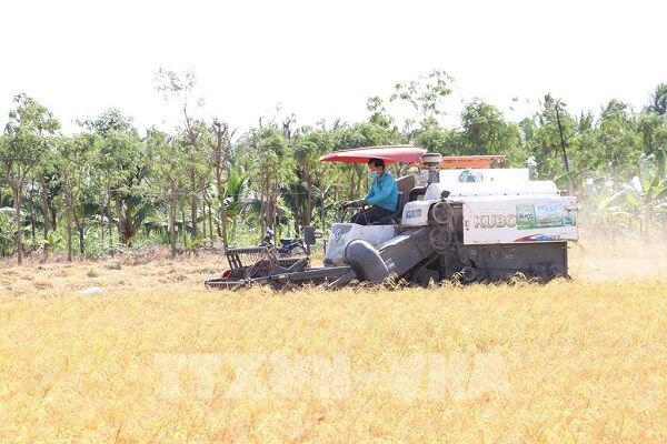 Nông dân Bến Tre thu hoạch lúa Thu Đông. Ảnh: Huỳnh Phúc Hậu - TTXVN