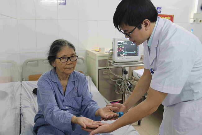 Bác sĩ thăm khám cho bệnh nhân là Trần Thị T (85 tuổi) sau ca phẫu thuật