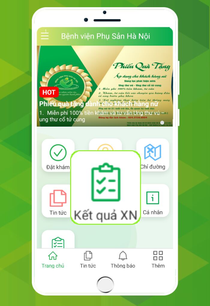 Bên cạnh tính năng đặt lịch thì App này còn giúp hỗ trợ nhận kết quả xét nghiệm. Người dùng chỉ cần nhập mã bệnh nhân tại bệnh viện Phụ sản Hà Nội ứng dụng sẽ cho phép kiểm tra kết quả xét nghiệm tức thì, cũng như tra lại kết quả cũ giúp khách hàng dễ dàng quản lý, tránh việc thất lạc kết quả không mong muốn.