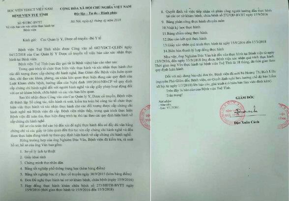 Ngày 12/12/2018, Bệnh viện Tuệ Tĩnh đã có Văn bản số 413/BC-BVTT gửi Cục Quản lý Y, Dược Cổ truyền báo cáo về việc xác nhận thực hành tại Bệnh viện. Trong đó, nêu rõ hồ sơ của toàn bộ cán bộ đến xin đề nghị thực hành đều có đầy đủ văn bằng chứng chỉ và các giấy tờ liên quan đến thủ tục xin cấp chứng chỉ hành nghề đều thực hiện đúng trình tự theo quy định.