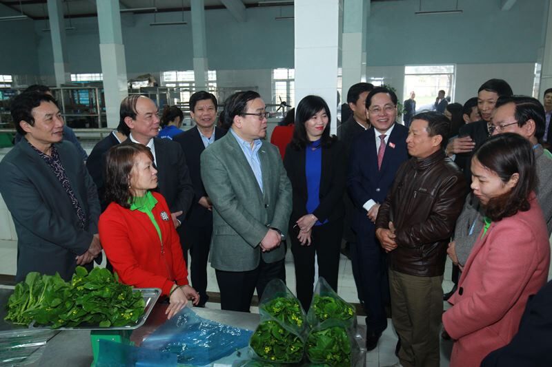 Bí thư Thành ủy Hà Nội Hoàng Trung Hải cùng đoàn công tác của TP Hà Nội thăm HTX rau sạch Chúc Sơn (huyện Chương Mỹ).