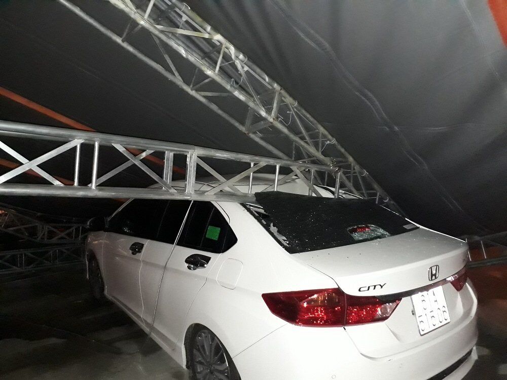 Tại hiện trường, khung sắt đổ sập đè bẹp 1 chiếc xe ô tô đỗ ở đó