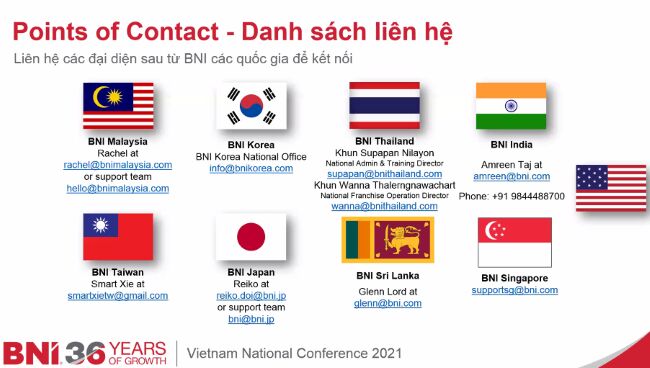 Hội nghị đã nhận được lời chúc mừng và những chia sẻ chân thành từ ông Graham Weihmiller – Chủ tịch đồng thời là CEO BNI toàn cầu, cũng như sự tham dự và kết nối thương mại quốc tế từ giám đốc BNI quốc gia các nước Ấn Độ, Hàn Quốc, Malaysia, Nhật Bản, Thái Lan, Singapore, Sri Lanka và Mỹ.